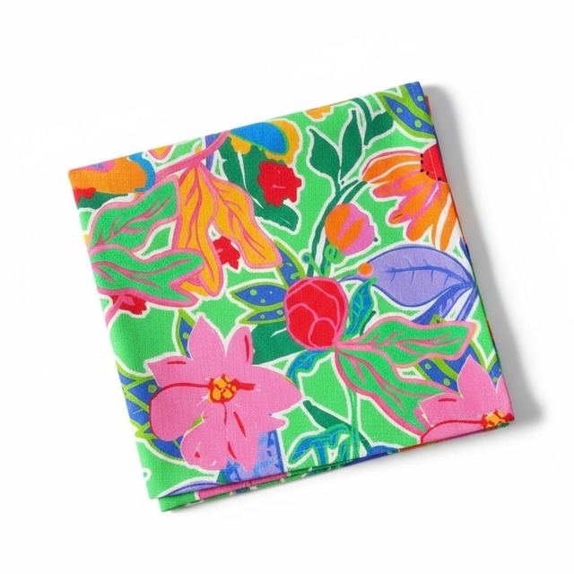 **ニュージーランドからの贈り物** 鮮やかな色彩の花柄が美しいテーブルナプキンの2枚セット(同じグリーンの柄の2枚組)。コットンとリネンの優しい風合いで、食卓を明るく彩り、毎日の食事やティータイムをより特別なひとときにしてくれます。日常使いにはもちろん、ギフトとしても喜ばれるアイテムです。 別商品で同じ色柄のティータオルのご用意もございます。 【素材】綿80%、麻20% 【サイズ】縦43cm×横43cm 【色】グリーン ※商品画像は、撮影環境やご使用の閲覧環境により、実際の色味と異なって見える場合がございます。予めご了承ください。 ▶オーナーの旅日記 ニュージーランドの家庭では、テーブルナプキンが当たり前のようにいつも使用されていました。カトラリーを置くため、そして食事中口元を拭くために日常使いされていて、約2か月半の滞在でその習慣にも慣れたオーナーなのでした。この鮮やかな色合いのナプキンは、食卓を華やかにしてくれること間違いなしです。