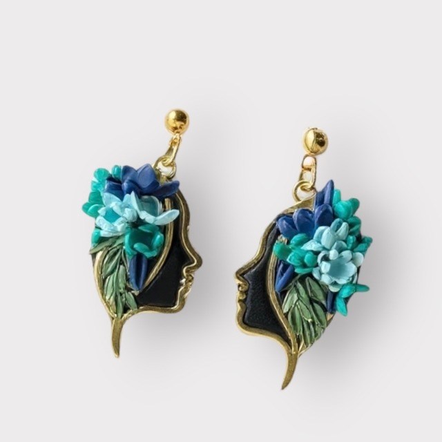 **ニュージーランドからの贈り物** アートのような女性の顔をかたどったピアス。ブルーの花とグリーンの髪飾りが華やかさを添えています。耳元でさりげなく女性らしさを主張するこのピアス。個性的で特別感のあるハンドメイドアクセサリーは、自分へのご褒美やギフトにも最適です。 【サイズ】縦4cm×横2cm ※商品の特性上、色合いや質感に個体差が生じています。 ※商品画像は、撮影環境やご使用の閲覧環境により、実際の色味と異なって見える場合がございます。予めご了承ください。 ▶オーナーの旅日記 ニュージーランドオークランドのマーケットで出会ったジュエリー作家の女性。すべて彼女によるハンドメイド作品で、どれも他に無い個性的なデザインが施されていました。素敵な方に手に取ってもらえますように…!