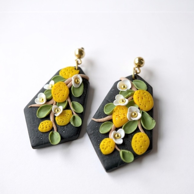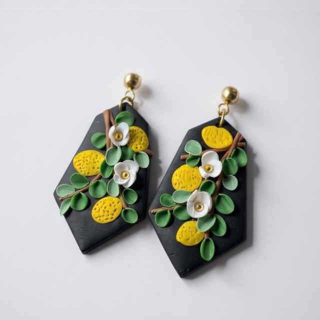 **ニュージーランドからの贈り物** 黒を背景にレモンと白い小花と緑をあしらった、シックで華やかなピアス。日本ではなかなか見ないデザインです。ハンドメイドならではの温かみがあり、着ける人の個性を引き立てるアクセサリーです。左右で少しデザインが異なっているのもポイント。 ☆類似のピアスもございます。少しだけデザインが異なるため、ご確認ください。 【サイズ】縦4.4cm×横2.4cm ※商品の特性上、色合いや質感に個体差が生じています。 ※商品画像は、撮影環境やご使用の閲覧環境により、実際の色味と異なって見える場合がございます。予めご了承ください。 ▶オーナーの旅日記 ニュージーランドオークランドのマーケットで出会ったジュエリー作家の女性。すべて彼女によるハンドメイド作品で、どれも他に無い個性的なデザインが施されていました。素敵な方に手に取ってもらえますように…!