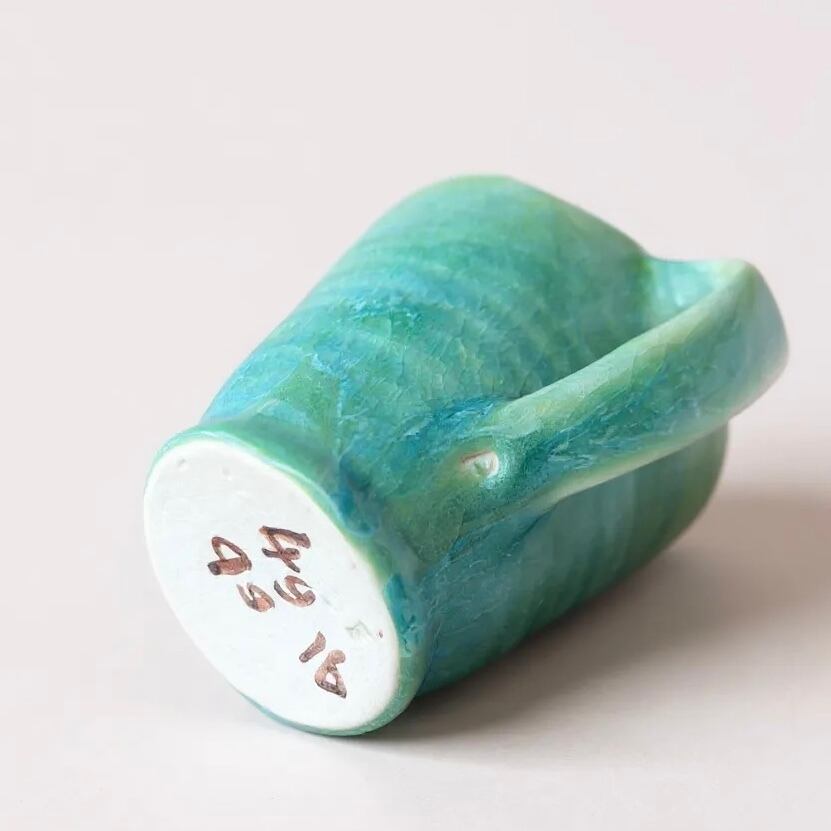 深みのあるエメラルドグリーンに、釉薬(焼き物の表面に施されるガラス質のコーティング材)の流れが生み出す深い森のような表情。奥行きのある色味と質感を与え、手仕事の痕跡が残る雰囲気が、使うたびに心を落ち着かせてくれる一品です。