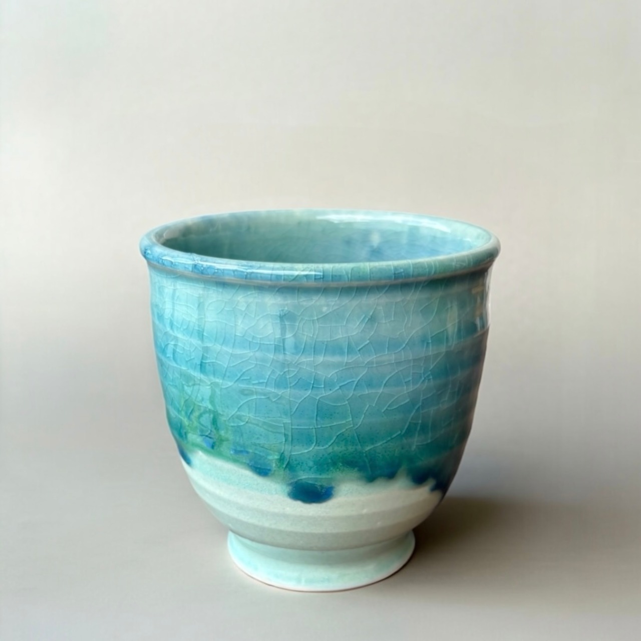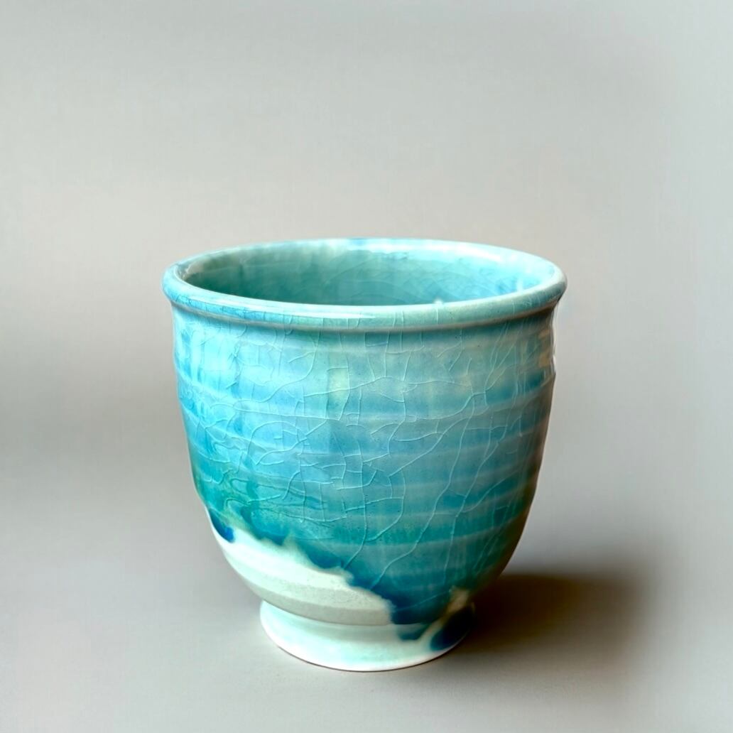 青、エメラルドグリーン、ライトグリーンが自然と優しく溶け合い、まるで海の深さと揺らぎを映し出すような湯呑。 ひとつひとつ手作業で仕上げられた釉薬(焼き物の表面に施されるガラス質のコーティング材)の流れは、同じものがひとつとしてない、世界にひとつだけの表情を持っています。 光の角度によって色が変化し、眺めても使っても心地よい、静かな存在感を放つ一品です。