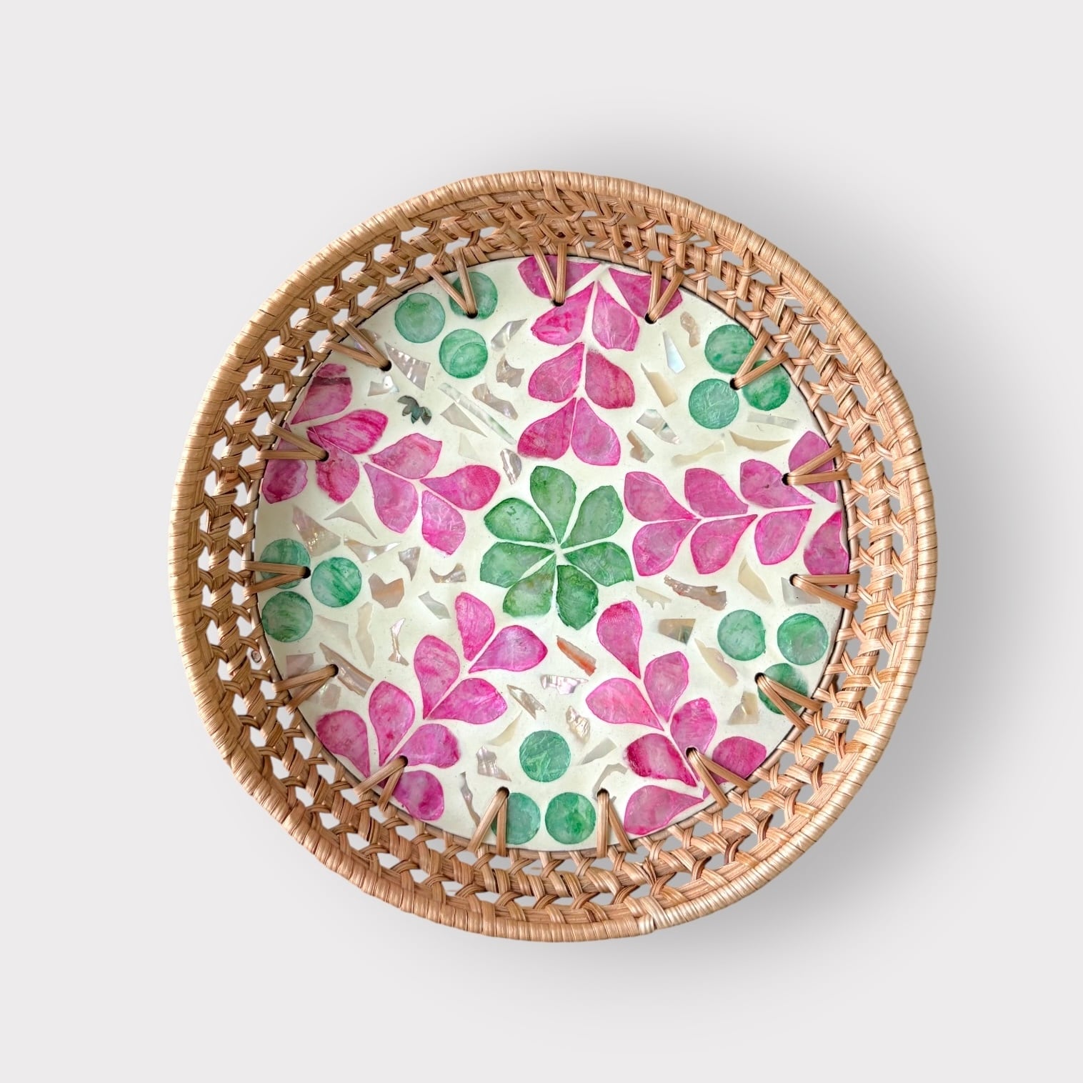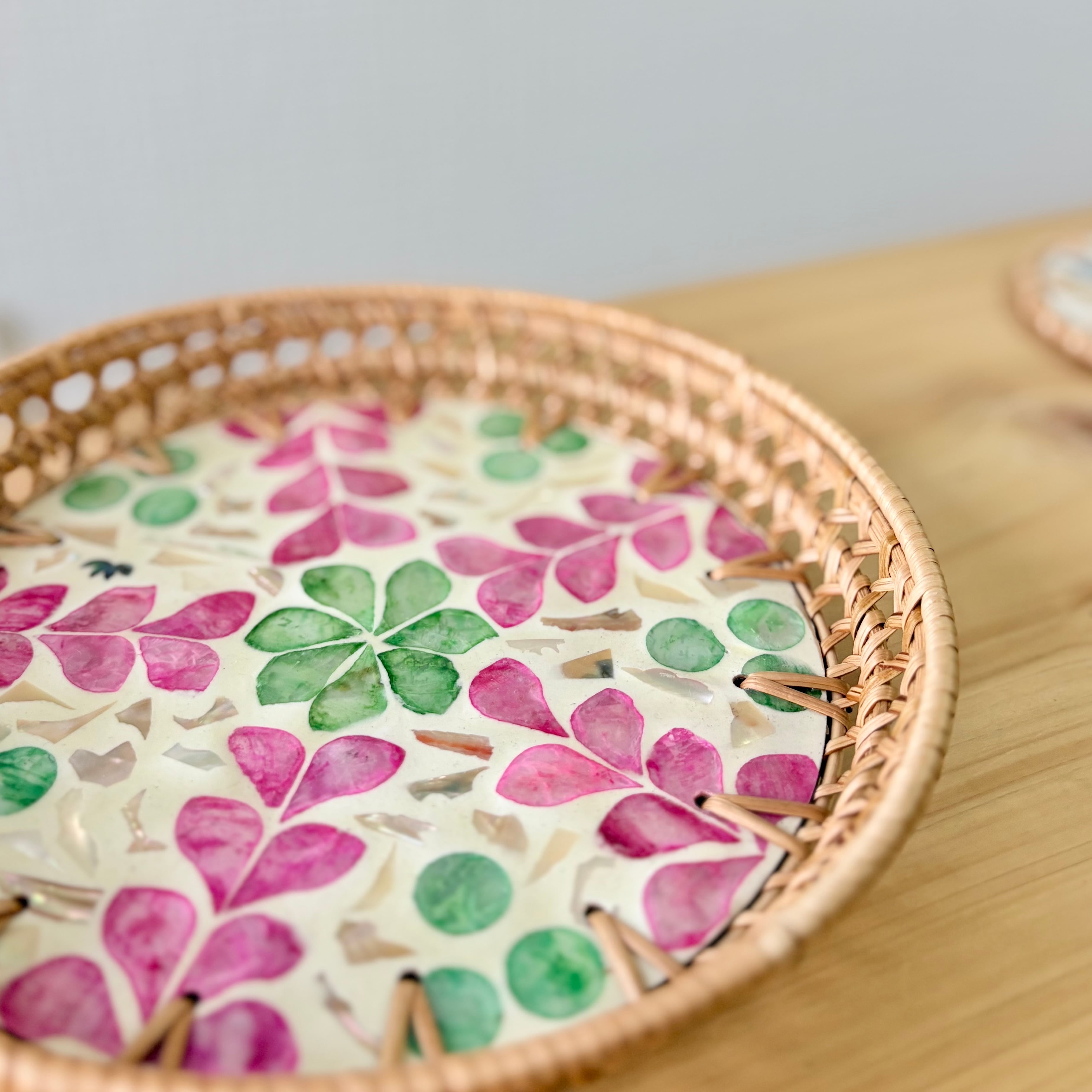 海を編む ラタンと貝殻のトレー(ラウンドM / グリーン×ピンク)