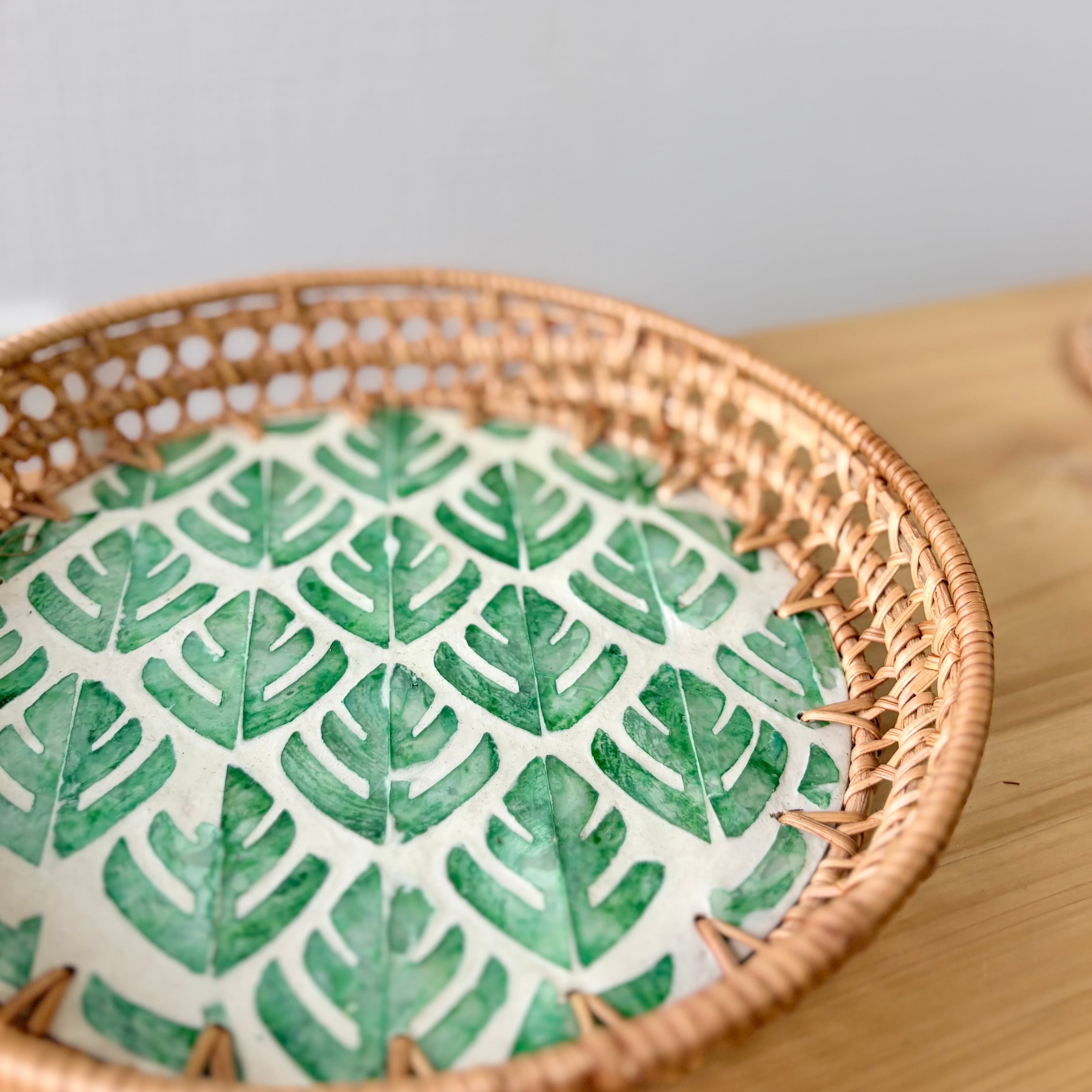 海を編む ラタンと貝殻のトレー(ラウンドM / グリーンリーフ)